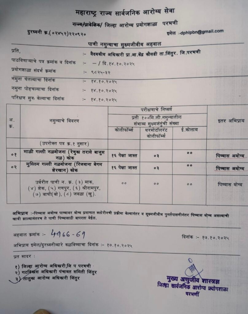 जिंतूर तालुक्यातील कोक गावातील नागरीकांना पुरवठा होणारे पाणी पिण्यास अयोग्य असल्याचा अहवाल आरोग्य विभागाने प्रसिद्ध केला आहे. जिल्हा सार्वजनिक आरोग्य प्रयोगशाळा, परभणी यांनी घेतलेल्या तपासणीत या गावातील पाण्यात जिवाणूंचा प्रादुर्भाव आढळल्याने गावकऱ्यांमध्ये तीव्र नाराजी व्यक्त होत आहे.